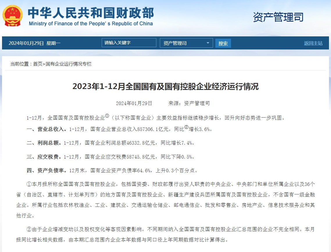1月29日,財政部在其官方網站公布2023年1-12月全國國有及國有控股企業(ye) 經濟運行情況。