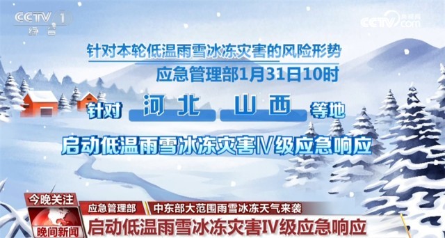 針對本輪低溫雨雪冰凍災害的風險形勢,應急管理部1月31日10時,針對河北、山西等地啟動低溫雨雪冰凍災害Ⅳ級應急響應。同時,國家防災減災救災委員會(hui) 辦公室、應急管理部等部門派出2個(ge) 工作組分赴河南和湖北,協助指導低溫雨雪冰凍災害防範應對工作。中國氣象局1月31日上午啟動重大氣象災害(雨雪冰凍)Ⅲ級應急響應。