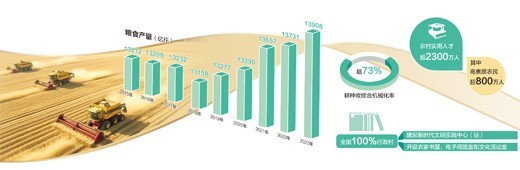 2023年,克服黃淮罕見“爛場雨”、華北東(dong) 北局地嚴(yan) 重洪澇、西北局部幹旱等災害影響,全年糧食產(chan) 量13908.2億(yi) 斤,高基數上增產(chan) 177.6億(yi) 斤,再創曆史新高;大豆播種麵積穩中有增,連續兩(liang) 年穩定在1.5億(yi) 畝(mu) 以上。今年中央一號文件明確提出確保糧食產(chan) 量保持在1.3萬(wan) 億(yi) 斤以上的目標,重點是穩麵積、增單產(chan) 兩(liang) 手發力。