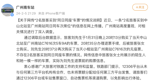 通過調取後台數據顯示,旅客劉先生於(yu) 1月31日晚上20時13分購買(mai) 了當天中山北站至廣州南站C7616次5車9A的車票,20時35分辦理退票手續,後被旅客張女士購買(mai) 。劉先生20時37分再次購買(mai) 了當天小欖站至廣州南站C7616次的無座票。不存在2名旅客買(mai) 到同日同座車票的情況。網傳(chuan) 信息中旅客張女士所展示的陌生人和她一模一樣的車票,實際為(wei) 劉先生退票前的購票信息。