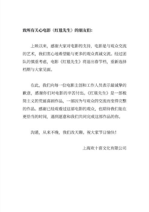 果然,上映6天後,《紅毯先生》宣布撤檔,表示“期待能在更恰當的時間,遇到願意和我們(men) 共同完成這部作品的你”。事實上,這已是該片第二次更換檔期,原本定的上映日期是2023年11月17日。