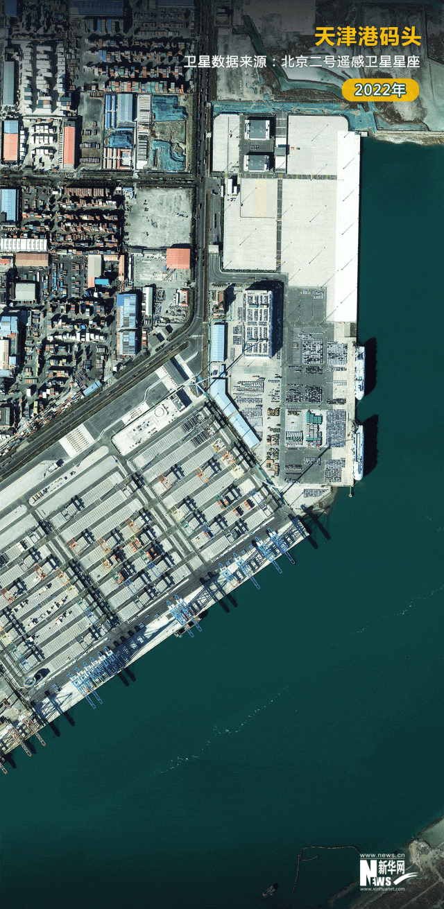 數據顯示,天津港2023年完成集裝箱吞吐量2217萬(wan) 標準箱,同比增長5.5%,創曆史新高。衛星見證,一批批待出口的貨物排列在天津港的碼頭上。我國外貿出口的火熱場景躍然圖上。