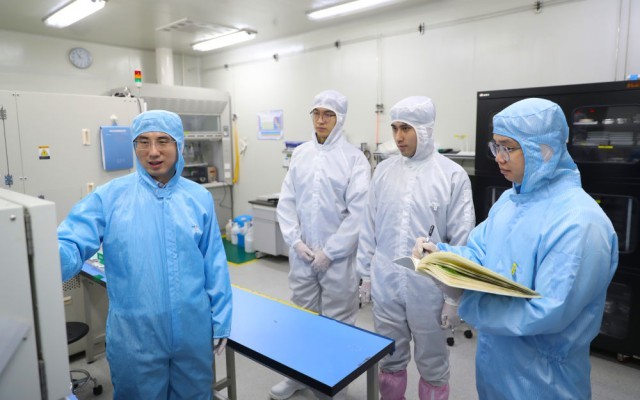 在位於(yu) 沈陽市的中國科學院金屬研究所納米碳基電子器件超淨實驗室,孫東(dong) 明(左一)與(yu) 指導的研究生一起討論反應離子刻蝕工藝設備的使用方法和注意事項(2月24日攝)。