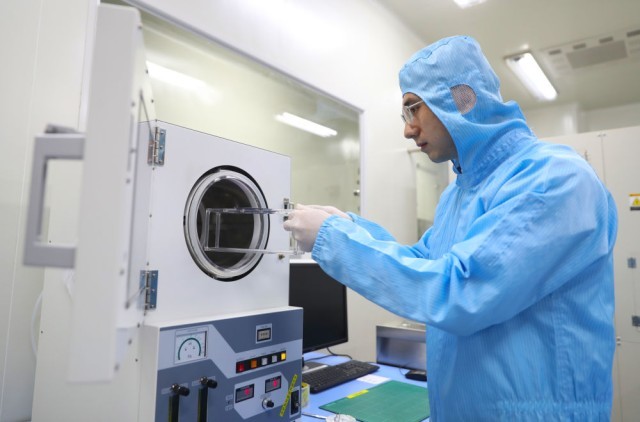 在位於(yu) 沈陽市的中國科學院金屬研究所納米碳基電子器件超淨實驗室,孫東(dong) 明從(cong) 前處理設備腔體(ti) 中取出實驗樣品(2月24日攝)。