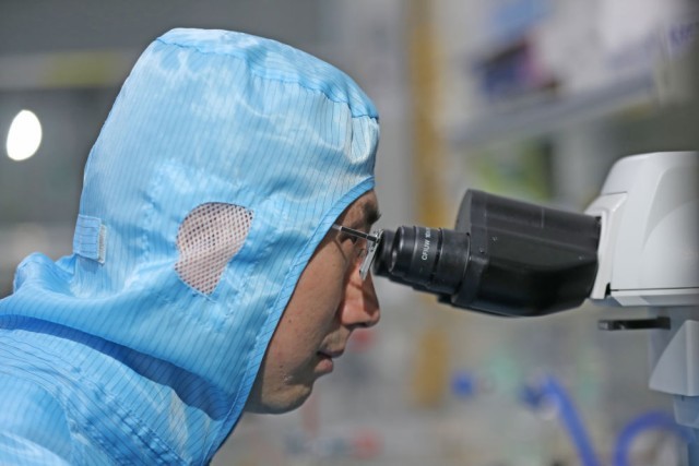在位於(yu) 沈陽市的中國科學院金屬研究所納米碳基電子器件超淨實驗室,孫東(dong) 明在聚焦光學顯微鏡前觀測實驗樣品的形貌(2月24日攝)。