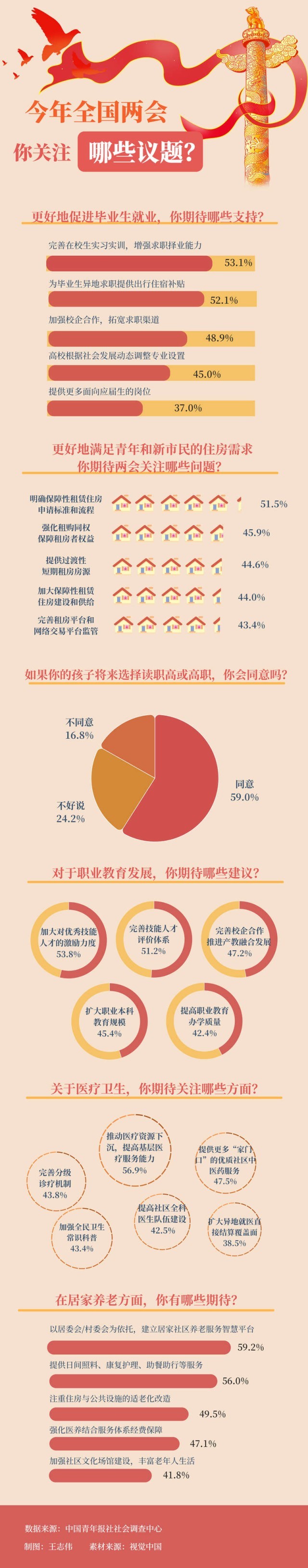 全國兩(liang) 會(hui) 時間開啟,哪些議題牽動著大家的心?全國兩(liang) 會(hui) 前夕,中青報社調中心進行的一項調查顯示,就業(ye) 、教育、醫療、住房等民生議題頗受關(guan) 注。今年全國兩(liang) 會(hui) ,你關(guan) 注哪些議題?