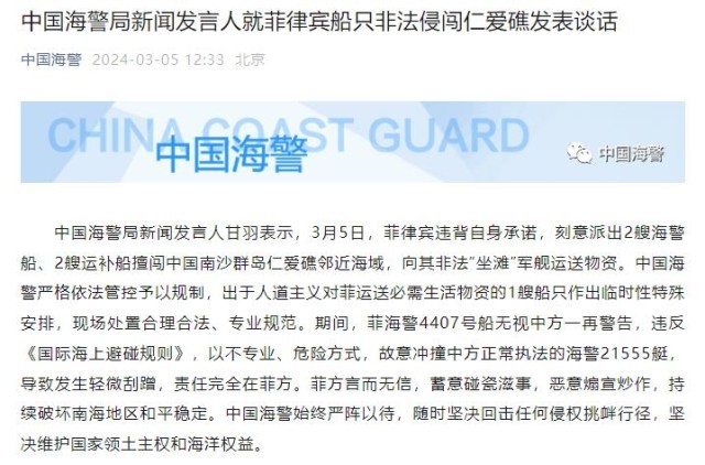 央視網消息:中國海警局新聞發言人甘羽表示,3月5日,菲律賓違背自身承諾,刻意派出2艘海警船、2艘運補船擅闖中國南沙群島仁愛礁鄰近海域,向其非法“坐灘”軍(jun) 艦運送物資。中國海警嚴(yan) 格依法管控予以規製,出於(yu) 人道主義(yi) 對菲運送必需生活物資的1艘船隻作出臨(lin) 時性特殊安排,現場處置合理合法、專(zhuan) 業(ye) 規範。期間,菲海警4407號船無視中方一再警告,違反《國際海上避碰規則》,以不專(zhuan) 業(ye) 、危險方式,故意衝(chong) 撞中方正常執法的海警21555艇,導致發生輕微刮蹭,責任完全在菲方。菲方言而無信,蓄意碰瓷滋事,惡意煽宣炒作,持續破壞南海地區和平穩定。中國海警始終嚴(yan) 陣以待,隨時堅決(jue) 回擊任何侵權挑釁行徑,堅決(jue) 維護國家領土主權和海洋權益。