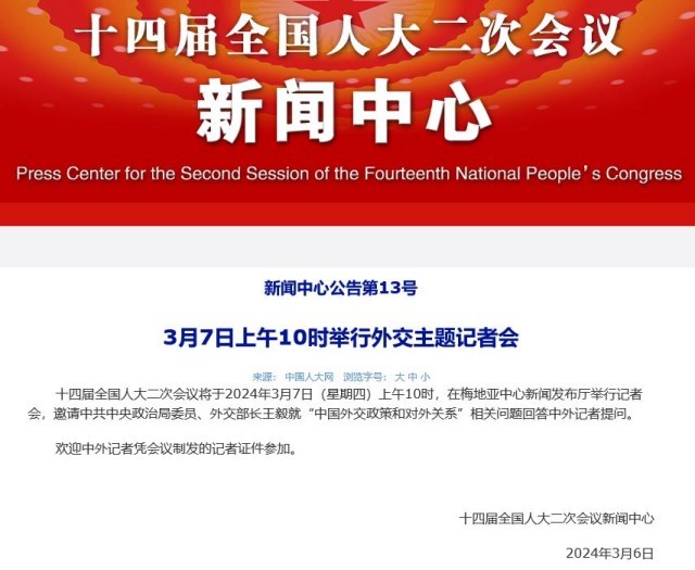 十四屆全國人大二次會議將於3月7日上午10時舉行外交主題記者會