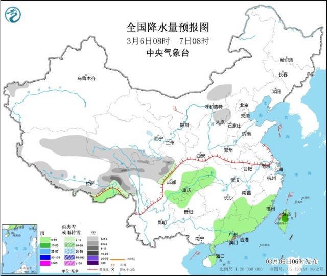 3月6日08時至7日08時,西藏東(dong) 部和南部、青海南部、川西高原北部、山西北部等地部分地區有小雪或雨夾雪,其中,西藏東(dong) 部、川西高原北部等地部分地區有中到大雪。江南東(dong) 部和南部、西南地區東(dong) 部、華南中東(dong) 部、台灣島等地部分地區有小雨,其中,台灣島北部等地部分地區有中雨。內(nei) 蒙古西北部部分地區有4~5級風(見圖1)。