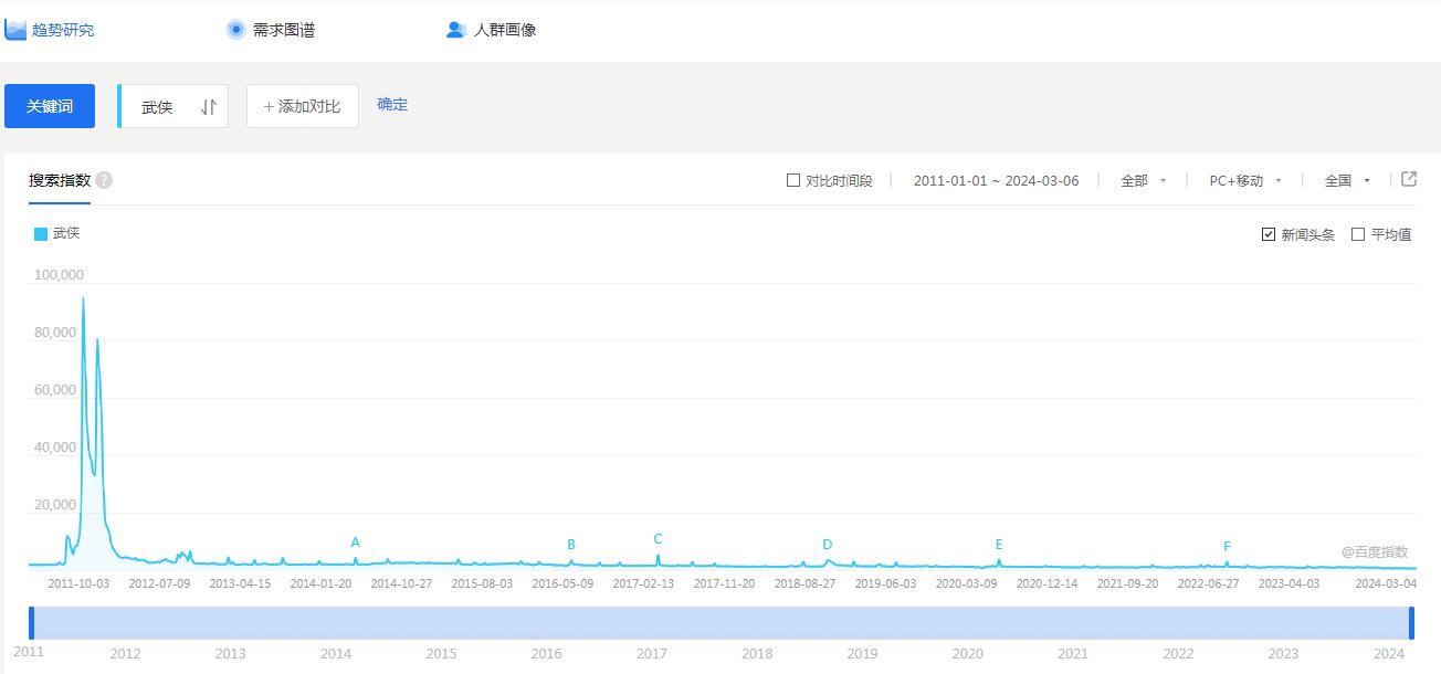 花開花落,少年子弟江湖老。幾十載春秋過去,如今的武俠(xia) 小說陷入尷尬境地,令人唏噓。據百度指數,“武俠(xia) ”在2011年憑借甄子丹、金城武主演的同名電影迎來最後的熱度巔峰後,一路“躺平”。