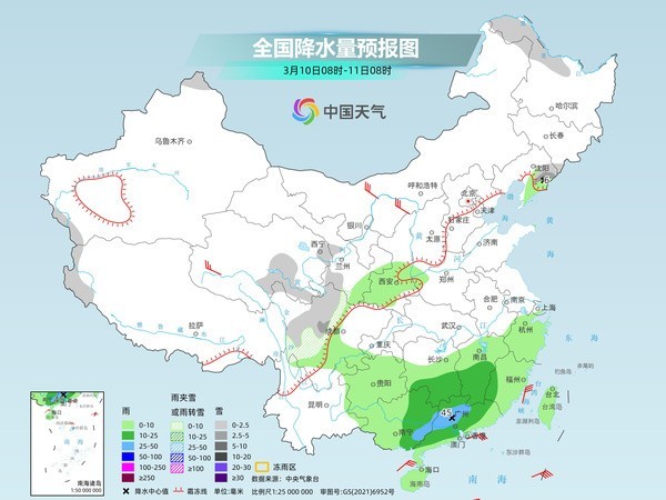 今明天,我國降水南多北少的格局延續,其中華南部分地區有大雨。中央氣象台預計,新疆北疆北部、西藏西部、青海東(dong) 部和南部、甘肅南部、川西高原、內(nei) 蒙古東(dong) 北部、黑龍江西北部、遼寧東(dong) 部等地部分地區有小到中雪或雨夾雪,其中,遼寧東(dong) 部等地局部地區有大雪(5~6毫米)。遼東(dong) 半島、陝西中南部、四川盆地南部、貴州大部、江南大部、華南、台灣島等地部分地區有小到中雨,其中,廣西東(dong) 南部、廣東(dong) 中北部等地部分地區有大雨。