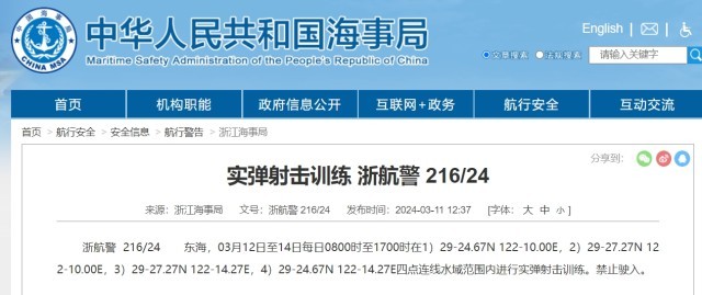 央視網消息:據中國海事局網站消息,浙江海事局發布航行警告,3月12日至14日每日8時至17時,東(dong) 海部分水域進行實彈射擊訓練,禁止駛入。