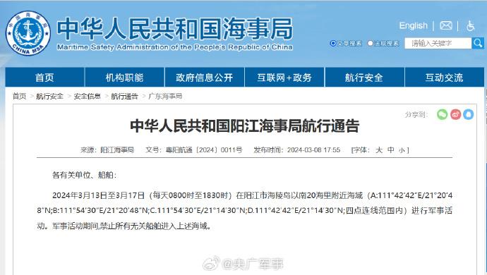 陽江海事局發布航行警告,3月13日至3月17日,每天8時至18時30分,在陽江市海陵島以南20海裏附近海域進行軍(jun) 事活動,禁止駛入。