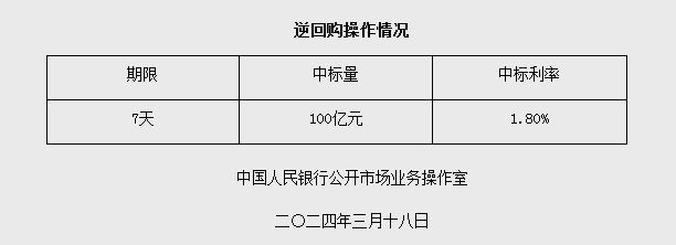 中新網3月18日電 據中國人民銀行網站消息,為(wei) 維護銀行體(ti) 係流動性合理充裕,2024年3月18日人民銀行以利率招標方式開展了100億(yi) 元逆回購操作。具體(ti) 情況如下: