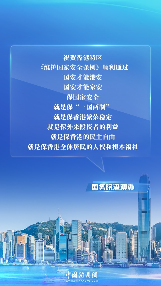 國務院港澳辦強調,香港國安條例順利通過,為(wei) 保持香港長期繁榮穩定、推動“一國兩(liang) 製”實踐行穩致遠提供更加堅實的製度保障。香港國安條例全麵有效維護國家安全,充分尊重和保障人權,更好統籌發展和安全。