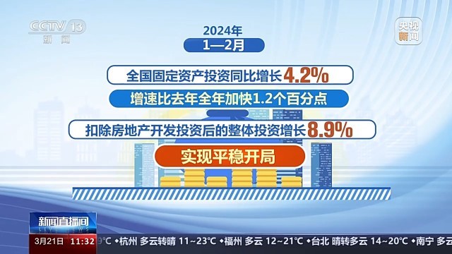 國家發展和改革委員會(hui) 副主任劉蘇社介紹,今年以來,國家發展改革委會(hui) 同有關(guan) 方麵,充分發揮政府投資的帶動放大效應,積極支持社會(hui) 資本參與(yu) 重大項目建設,著力擴大有效益的投資。1—2月,全國固定資產(chan) 投資同比增長4.2%,增速比去年全年加快1.2個(ge) 百分點;扣除房地產(chan) 開發投資後的整體(ti) 投資增長8.9%,實現平穩開局。