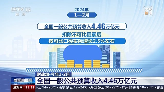財政部副部長廖岷介紹,今年1—2月,全國一般公共預算收入4.46萬(wan) 億(yi) 元,扣除不可比因素後,按可比口徑實際增長2.5%左右,保持恢複性增長,與(yu) 宏觀經濟穩中向好的態勢基本保持一致;全國一般公共預算支出同比增長6.7%,完成全年預算的15.3%,支出進度為(wei) 近5年同期最快。