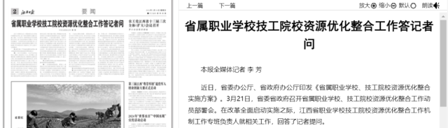 3月24日,《江西日報》發布了《省屬職業(ye) 學校技工院校資源優(you) 化整合工作答記者問》。