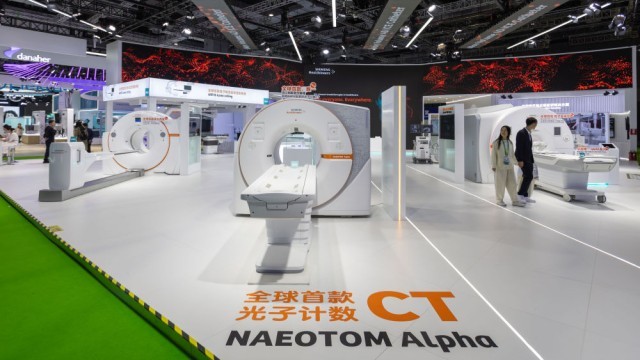 2023年11月8日在第六屆中國國際進口博覽會(hui) 醫療器械及醫藥保健展區拍攝的西門子展位。新華社記者 王翔 攝