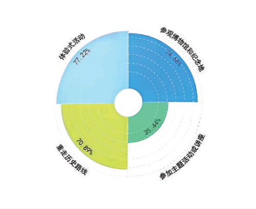愛國主義(yi) 教育入耳、入腦,更入心。此次調研中,79.75%的受訪者參與(yu) 過紅色旅遊,年齡主要集中在18~35歲之間。超過70%的人選擇參觀博物館和紀念地(74.68%)、重走曆史路線(70.89%)以及體(ti) 驗式活動(77.22%)三種形式,90.87%的受訪者表示,參與(yu) 紅色旅遊的目的是學習(xi) 曆史文化知識、接受紅色文化洗禮。