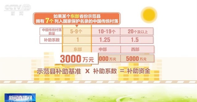 根據規定,中央財政對傳(chuan) 統村落集中連片保護利用示範縣予以定額獎補,其中東(dong) 、中、西部示範縣補助基準分別為(wei) 3000萬(wan) 元、4000萬(wan) 元、5000萬(wan) 元。同時,根據示範縣擁有中國傳(chuan) 統村落數量情況賦予相應獎補係數,擁有5—9個(ge) 、10—19個(ge) 、20個(ge) 及以上中國傳(chuan) 統村落的示範縣補助係數分別為(wei) 1、1.25、1.5。每個(ge) 示範縣的補助資金為(wei) 相應的補助基準乘以補助係數。舉(ju) 個(ge) 例子,如果某個(ge) 東(dong) 部省份示範縣擁有7個(ge) 列入國家保護名錄的中國傳(chuan) 統村落,中央財政將對這個(ge) 示範縣進行3000萬(wan) 元獎補。