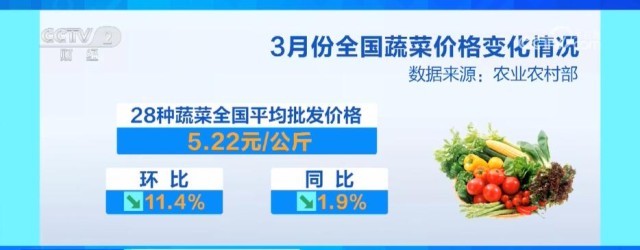 3月份,農(nong) 業(ye) 農(nong) 村部監測的28種蔬菜全國平均批發價(jia) 格為(wei) 每公斤5.22元,環比下降11.4%,同比下降1.9%。分品種看,23種蔬菜價(jia) 格環比下降,5種上漲,其中降幅較大的品種有菠菜、黃瓜、生菜和青椒。