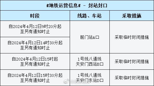 央視網消息:據@北京地鐵 微博消息,自2024年4月12日9時20分起至另有通知時止,前門站A口采取臨(lin) 時封閉措施;自2024年4月12日14時30分起至另有通知時止,前門站A口采取臨(lin) 時封閉措施;自2024年4月12日15時起至另有通知時止,1號線八通線天安門西站B口采取臨(lin) 時封閉措施;自2024年4月12日15時30分起至另有通知時止,1號線八通線天安門東(dong) 站D口采取臨(lin) 時封閉措施。