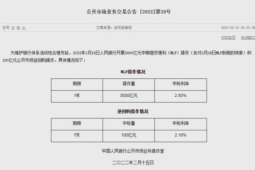 中新財經2月15日電 據中國人民銀行官網消息,為(wei) 維護銀行體(ti) 係流動性合理充裕,2022年2月15日人民銀行開展3000億(yi) 元中期借貸便利(MLF)操作(含對2月18日MLF到期的續做)和100億(yi) 元公開市場逆回購操作。(完)