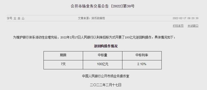 中新財經2月17日電 17日,據中國人民銀行官網消息,為(wei) 維護銀行體(ti) 係流動性合理充裕,2022年2月17日人民銀行以利率招標方式開展了100億(yi) 元逆回購操作,期限為(wei) 7天,中標利率為(wei) 2.10%。(完)
