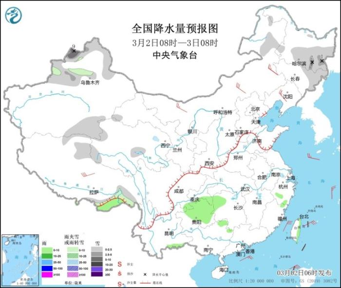 3月2日08時至3日08時,黑龍江東(dong) 南部、吉林東(dong) 部、新疆西北部等地部分地區有小到中雪或雨夾雪,其中,黑龍江東(dong) 南部、新疆北疆北部等地部分地區有大雪(5~9毫米)。貴州北部、湖南西北部等地部分地區有小雨。內(nei) 蒙古中北部、遼寧中部、西藏北部等地部分地區有4~6級風。