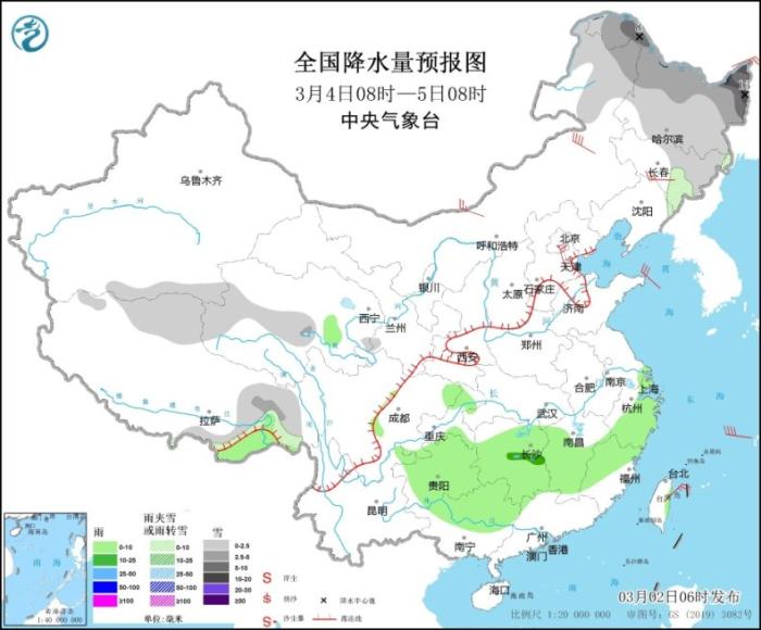3月4日08時至5日08時,內(nei) 蒙古東(dong) 北部、東(dong) 北地區中北部、西藏東(dong) 部、青海西部等地部分地區有小到中雪,其中,黑龍江東(dong) 北部等地部分地區有大到暴雪(10~13毫米)。江南大部、貴州大部、廣西中北部等地部分地區有小到中雨,其中,湖南中部等地部分地區有大雨。內(nei) 蒙古中東(dong) 部、東(dong) 北地區中南部、河北北部等地部分地區有4~6級風,其中,內(nei) 蒙古東(dong) 部部分地區有6~7級風。