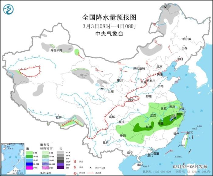 3月3日08時至4日08時,內(nei) 蒙古東(dong) 北部、黑龍江西北部、新疆沿天山地區等地部分地區有小到中雪(2.5~3毫米)。江淮大部、江漢東(dong) 部、江南大部、西南地區東(dong) 南部、廣西東(dong) 北部等地部分地區有小到中雨,其中,江西北部、浙江中部等地部分地區有大雨(25~35毫米)。內(nei) 蒙古、遼寧、新疆東(dong) 部、陝西北部、山西中部、河北北部、山東(dong) 半島等地部分地區有4~6級風,其中,內(nei) 蒙古西北部部分地區有6~7級風。