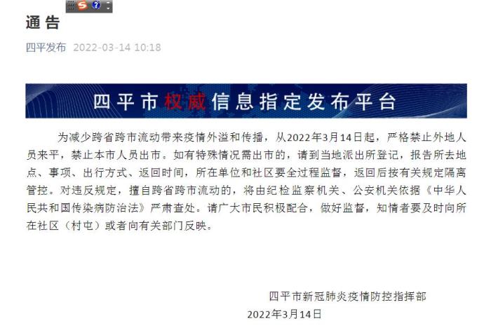 吉林四平:嚴格禁止外地人員來平,禁止本市人員出市