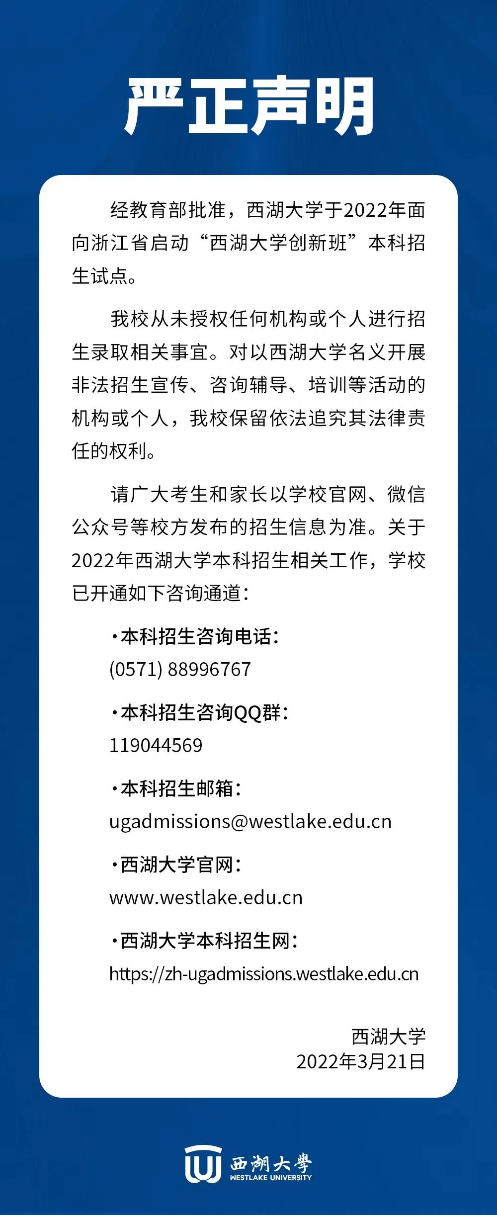 中新網3月21日電 據“西湖大學WestlakeUniversity”微信公眾(zhong) 號消息,3月21日,西湖大學發布《關(guan) 於(yu) 2022年西湖大學本科招生的嚴(yan) 正聲明》,聲明指出,經教育部批準,西湖大學於(yu) 2022年麵向浙江省啟動“西湖大學創新班”本科招生試點。該校從(cong) 未授權任何機構或個(ge) 人進行招生錄取相關(guan) 事宜。對以西湖大學名義(yi) 開展非法招生宣傳(chuan) 、谘詢輔導、培訓等活動的機構或個(ge) 人,該校保留依法追究其法律責任的權利。