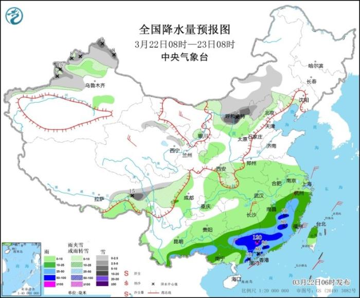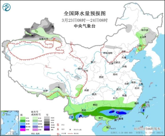 3月22日08時至23日08時,內(nei) 蒙古中東(dong) 部、新疆北部、西藏東(dong) 部、甘肅中部、陝西北部和東(dong) 南部、山西北部、河北西北部、北京西北部、遼寧西部等地部分地區有小到中雪或雨夾雪,其中,新疆北疆北部和伊犁河穀、西藏東(dong) 北部、內(nei) 蒙古中部、山西北部等地部分地區有大到暴雪(10~15毫米)。江南中東(dong) 部和南部、雲(yun) 南東(dong) 南部、華南大部、台灣島等地部分地區有中到大雨,其中,江西南部、福建西部、廣西東(dong) 北部、廣東(dong) 中北部及西部沿海等地局部地區有暴雨或大暴雨(100~120毫米)。內(nei) 蒙古西北部、青海北部、江南南部、華南北部等地部分地區有4~5級風(見圖2)。
