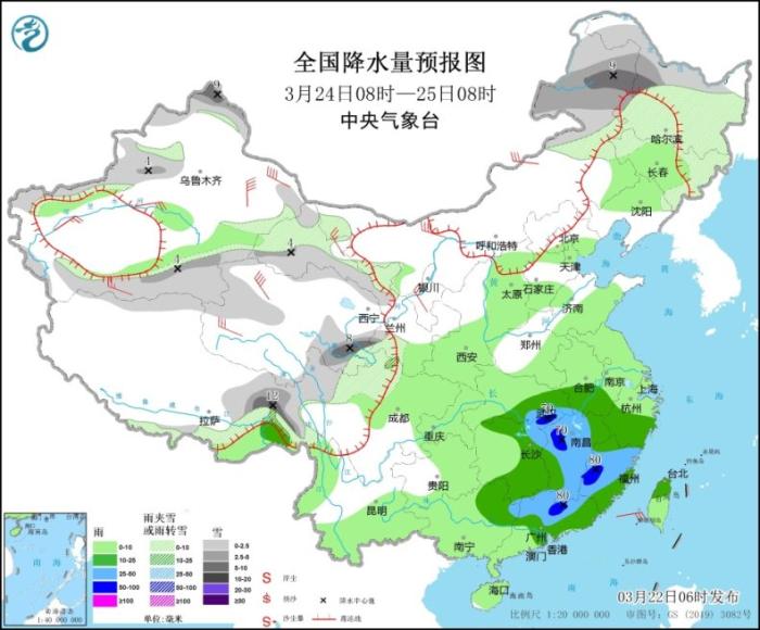 3月24日08時至25日08時,新疆北疆北部和南疆盆地西部、西藏東(dong) 部、青海南部和西部、甘肅南部和河西、川西高原北部、內(nei) 蒙古東(dong) 部、黑龍江、吉林西部和東(dong) 部等地部分地區有小到中雪或雨夾雪,其中,內(nei) 蒙古東(dong) 北部、黑龍江西部、新疆北疆北部、西藏東(dong) 北部、青海東(dong) 南部等地部分地區有大到暴雪(10~12毫米)。湖北東(dong) 南部、江西大部、福建西部和中部、廣東(dong) 中北部、廣西東(dong) 部等地部分地區有大雨,其中,湖北東(dong) 南部、江西西北部、福建西部、廣東(dong) 北部等地部分地區有暴雨(50~80毫米)。新疆、西北地區大部、內(nei) 蒙古中西部等地部分地區有4~6級風,其中,內(nei) 蒙古西部、新疆東(dong) 部、青海西部等地部分地區有6~7級風(見圖4)。