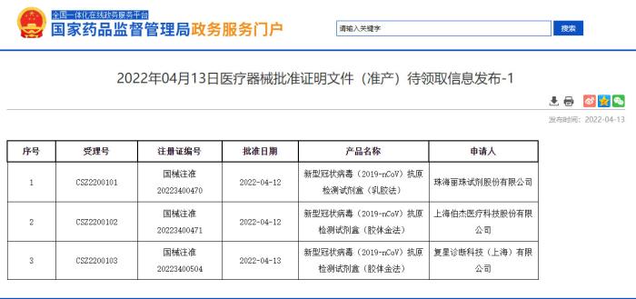 4月13日,國家藥監局又批準3個(ge) 新冠病毒抗原檢測試劑上市(見下圖)。新冠病毒抗原檢測試劑適用於(yu) 《新冠病毒抗原檢測應用方案(試行)》(聯防聯控機製綜發〔2022〕21號)規定的人群。截至4月13日,國家藥監局已批準27個(ge) 新冠病毒抗原檢測試劑產(chan) 品。(總台央視記者 餘(yu) 靜英)
