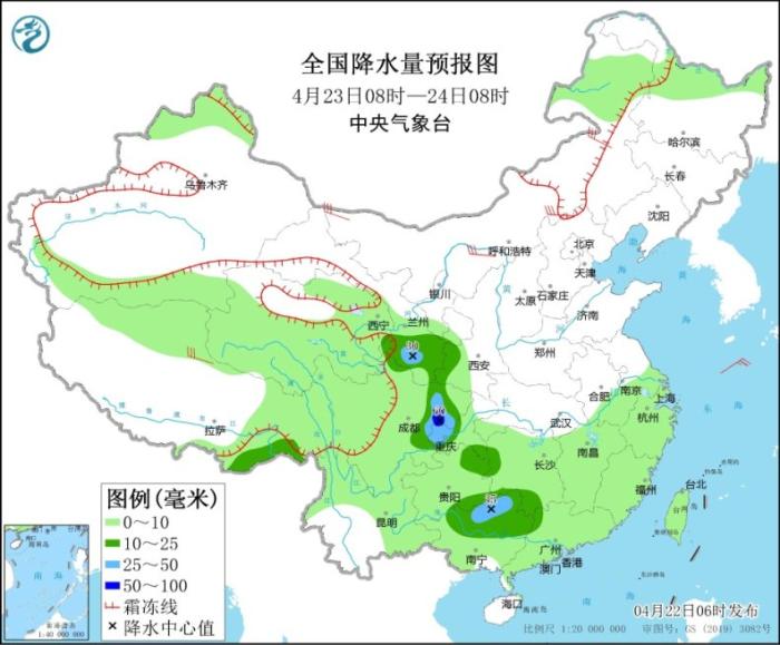 圖1 全國降水量預報圖(4月22日08時-23日08時)