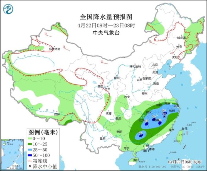 4月22日08時至23日08時,新疆北疆北部、青海南部、西藏北部等地部分地區有小到中雪或雨夾雪,局地有大到暴雪。江淮南部、江漢東(dong) 部、江南大部、華南北部等地部分地區有中到大雨,其中,安徽南部、湖南東(dong) 部、江西中北部、浙江西部、廣西東(dong) 北部等地局地有暴雨(50~70毫米)。新疆北部、內(nei) 蒙古、東(dong) 北南部等地部分地區有4~6級風(見圖1)。