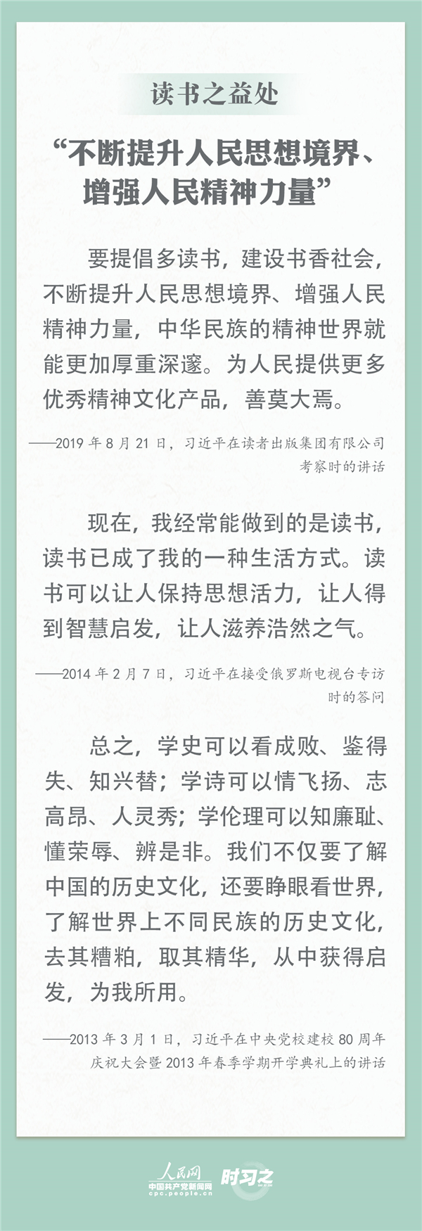 讀書(shu) 滋養(yang) 美好心靈。習(xi) 近平總書(shu) 記曾多次談及讀書(shu) 的好處,“人民群眾(zhong) 多讀書(shu) ,我們(men) 的民族精神就會(hui) 厚重起來、深邃起來” 。4月23日是世界讀書(shu) 日,跟習(xi) 近平總書(shu) 記學讀書(shu) 之道,讓學習(xi) 點亮生活,讓全民閱讀蔚然成風。