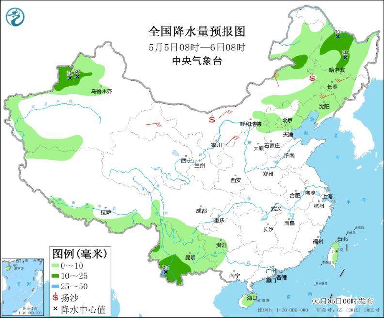 5月5日8時至6日8時,新疆西北部、內(nei) 蒙古東(dong) 部、華北中北部、東(dong) 北地區大部、西南地區南部等地的部分地區有小到中雨,局地有大雨。甘肅河西、內(nei) 蒙古、東(dong) 北地區等地有5~7級風,部分地區並伴有浮塵或揚沙天氣。渤海、渤海海峽、黃海北部和中西部海域將有6~7級、陣風8級的偏南風轉東(dong) 北風。