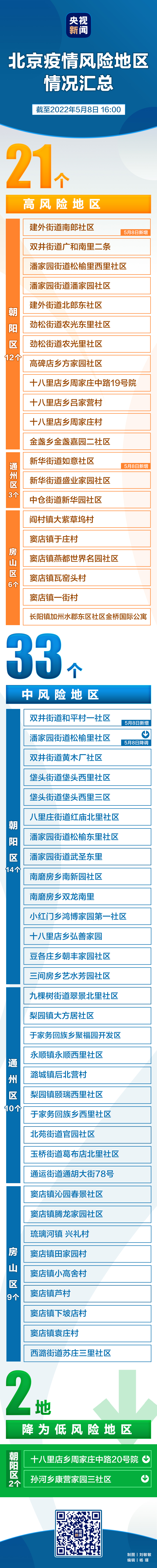 截至2022年5月7日24時,朝陽區十八裏店鄉(xiang) 周家莊中路20號院、孫河鄉(xiang) 康營家園三社區近14天各累計報告1例本土確診病例。經北京市疾控中心評估,按照《北京市新冠肺炎疫情風險分級標準》,即日起將朝陽區十八裏店鄉(xiang) 周家莊中路20號院、孫河鄉(xiang) 康營家園三社區由中風險地區降為(wei) 低風險地區。