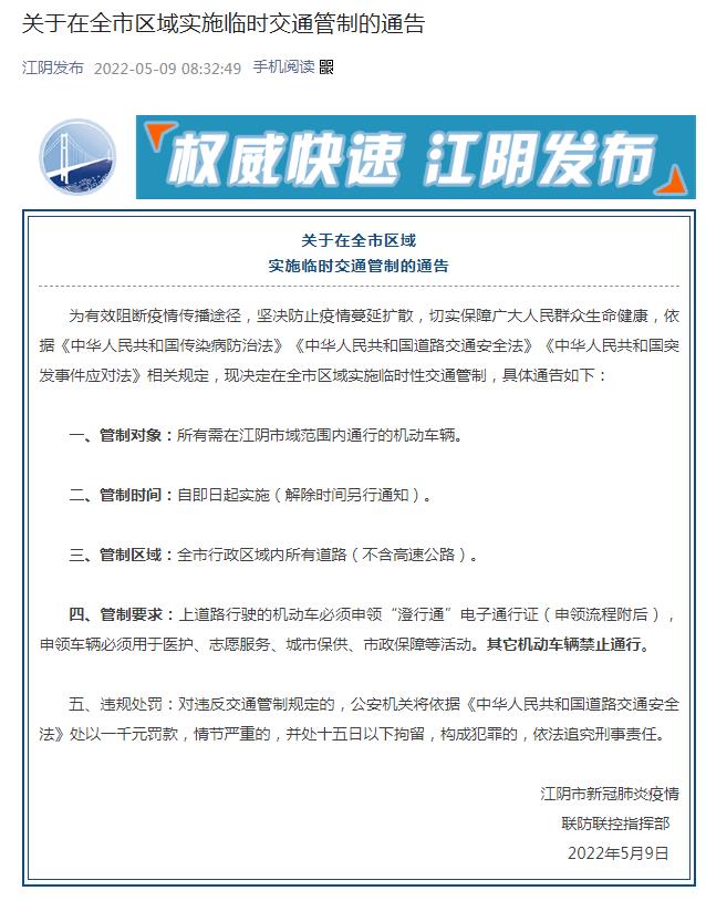 中新網5月9日電 據“江陰發布”微信公眾(zhong) 號消息,江蘇省江陰市新冠肺炎疫情聯防聯控指揮部9日發布關(guan) 於(yu) 在全市區域實施臨(lin) 時交通管製的通告。通告稱,為(wei) 有效阻斷疫情傳(chuan) 播途徑,堅決(jue) 防止疫情蔓延擴散,切實保障廣大人民群眾(zhong) 生命健康,依據《中華人民共和國傳(chuan) 染病防治法》《中華人民共和國道路交通安全法》《中華人民共和國突發事件應對法》相關(guan) 規定,現決(jue) 定在全市區域實施臨(lin) 時性交通管製。
