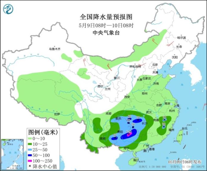 5月9日08時至10日08時,西南地區東(dong) 部和南部、江南西部、華南北部和西部等地部分地區有中到大雨,其中,湖南中西部、重慶東(dong) 南部、貴州東(dong) 南部、廣西北部等地部分地區有暴雨或大暴雨(100~140毫米)。甘肅河西、內(nei) 蒙古大部、東(dong) 北地區等地部分地區有4~6級風。