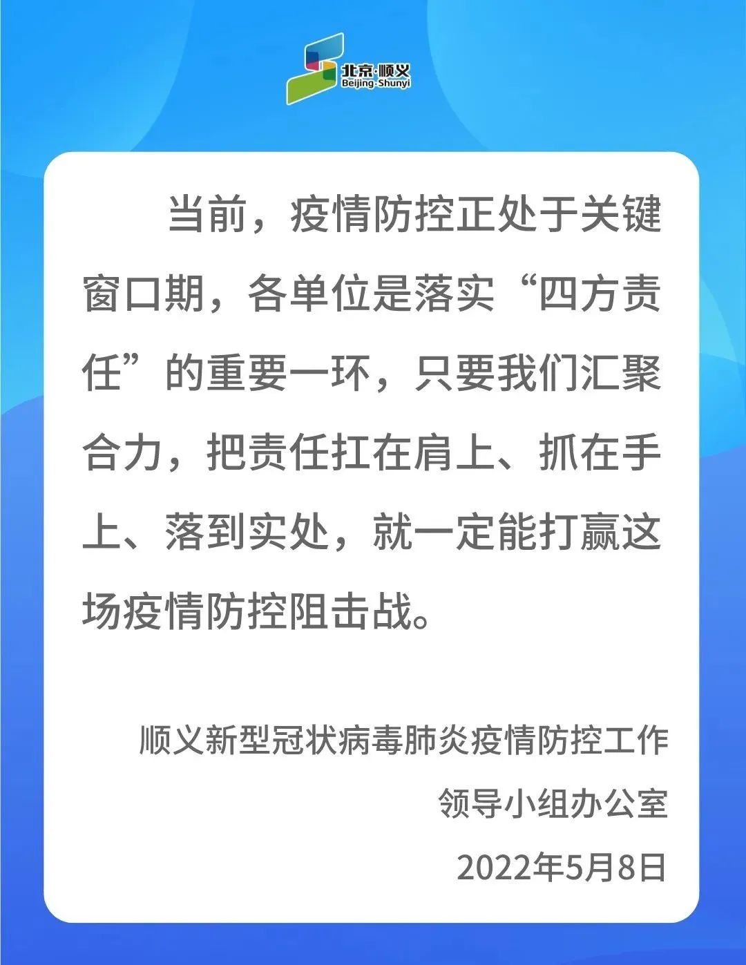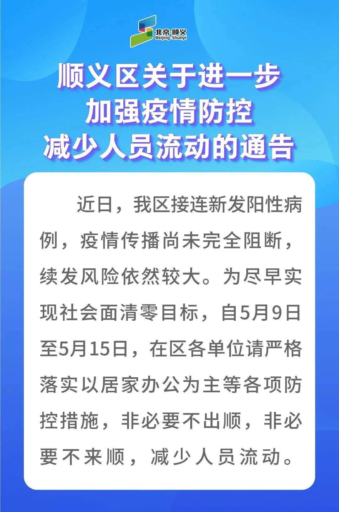 中新網5月8日電 據“北京順義(yi) ”微信公眾(zhong) 號消息,5月8日,順義(yi) 區發布《順義(yi) 區關(guan) 於(yu) 進一步加強疫情防控減少人員流動的通告》指出,為(wei) 盡早實現社會(hui) 麵清零目標,自5月9日至5月15日,在區各單位請嚴(yan) 格落實以居家辦公為(wei) 主等各項防控措施,非必要不出順,非必要不來順,減少人員流動。