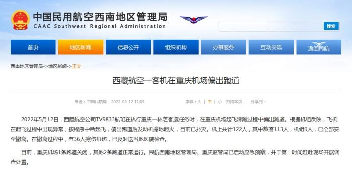 中新網5月12日電 據民航局網站消息,民航局今日就西藏航空一客機在重慶機場偏出跑道發布通報。通報稱,2022年5月12日,西藏航空公司TV9833航班在執行重慶—林芝客運任務時,在重慶機場起飛滑跑過程中偏出跑道。根據機組反映,飛機在起飛過程中出現異常,按程序中斷起飛,偏出跑道後發動機擦地起火,目前已撲滅。機上共計122人,其中旅客113人,機組9人,已全部安全撤離。在撤離過程中,有36人擦傷(shang) 扭傷(shang) ,已及時送當地醫院檢查。