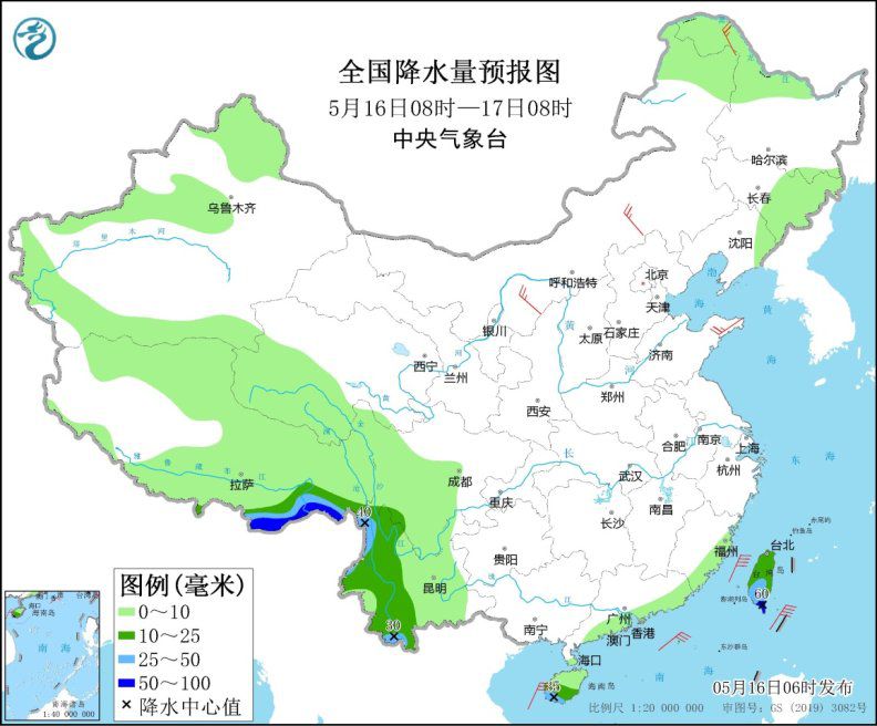 5月16日08時至17日08時,雲(yun) 南西部、西藏東(dong) 南部、海南島南部、台灣島等地部分地區有中到大雨,其中,西藏東(dong) 南部、台灣島南部等地部分地區有暴雨。黑龍江北部、內(nei) 蒙古中部、山東(dong) 半島等地部分地區有4~6級風。東(dong) 海南部、台灣海峽、南海北部、北部灣有6~7級、陣風8級的風,其中,台灣海峽風力可達8級、陣風9級。