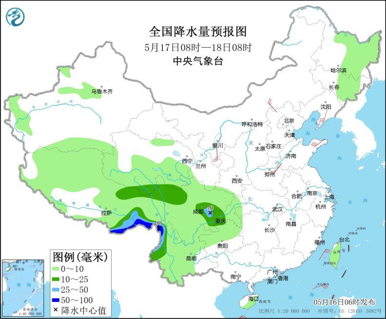 5月17日08時至18日08時,四川盆地南部、雲(yun) 南西部、青海南部、西藏東(dong) 部等地部分地區有中到大雨,其中,西藏東(dong) 南部、雲(yun) 南西北部等地部分地區有暴雨(50~90毫米)。東(dong) 北地區南部、黃淮東(dong) 部、內(nei) 蒙古中部等地部分地區有4~6級風。黃海大部、台灣海峽、南海東(dong) 北部有5~7級、陣風8級的風。