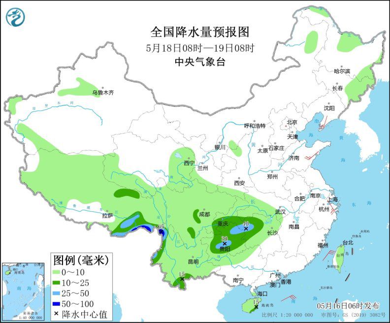5月18日08時至19日08時,貴州大部、重慶南部、湖南西部、雲(yun) 南南部和西部、海南島東(dong) 南部、西藏東(dong) 南部等地部分地區有中到大雨,其中,西藏東(dong) 南部、雲(yun) 南西北部等地部分地區有暴雨(50~65毫米)。黃淮東(dong) 部、遼東(dong) 半島等地部分地區有4~5級風。