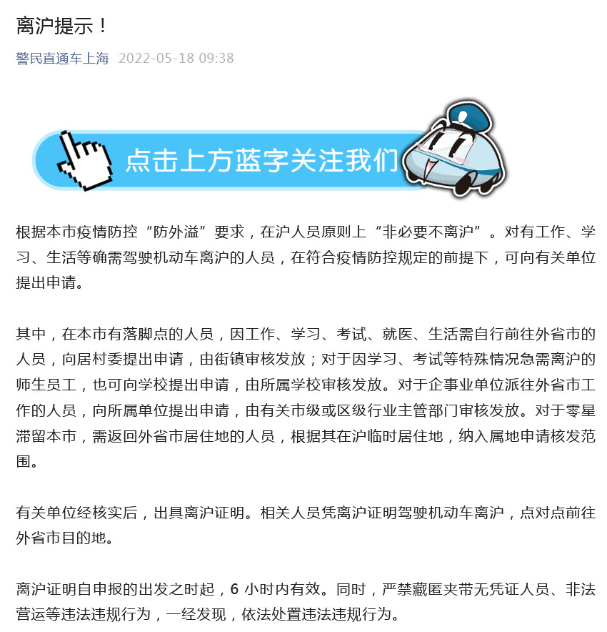 中新網5月18日電 據上海市公安局微信公眾(zhong) 號消息,根據上海市疫情防控“防外溢”要求,在滬人員原則上“非必要不離滬”。對有工作、學習(xi) 、生活等確需駕駛機動車離滬的人員,在符合疫情防控規定的前提下,可向有關(guan) 單位提出申請。有關(guan) 單位經核實後,出具離滬證明。相關(guan) 人員憑離滬證明駕駛機動車離滬,點對點前往外省市目的地。離滬證明自申報的出發之時起,6 小時內(nei) 有效。同時,嚴(yan) 禁藏匿夾帶無憑證人員、非法營運等違法違規行為(wei) ,一經發現,依法處置違法違規行為(wei) 。